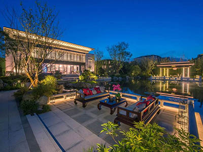 在大片留白的土地上,海上院子从容规划一座尺度恢弘的东方园林,一轴十景、五街、八园、十二巷,传承儒家礼序 融情江南山水,以现代造园⼿法,演绎东方传统绝代风华。约3500㎡的中央景观区,融汇山池、六角亭、戏台、石舫,实现移步异景的院落诗意居境。