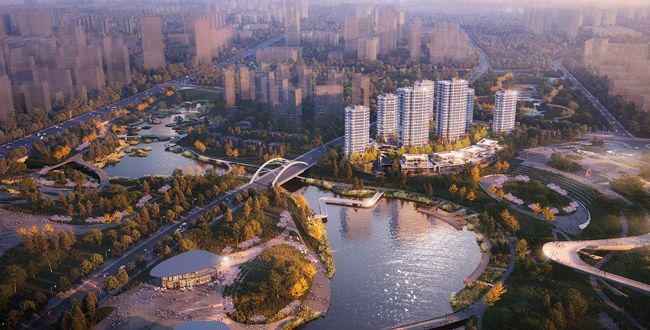将全新居住空间嵌入约1100亩公园之中,让湖、公园、住区无界串联,打造成为全新的生活模式。在“茂林修竹、鸾鸟自歌”中归家,于城市、自然中,寻得生活怡然的全新体验。
