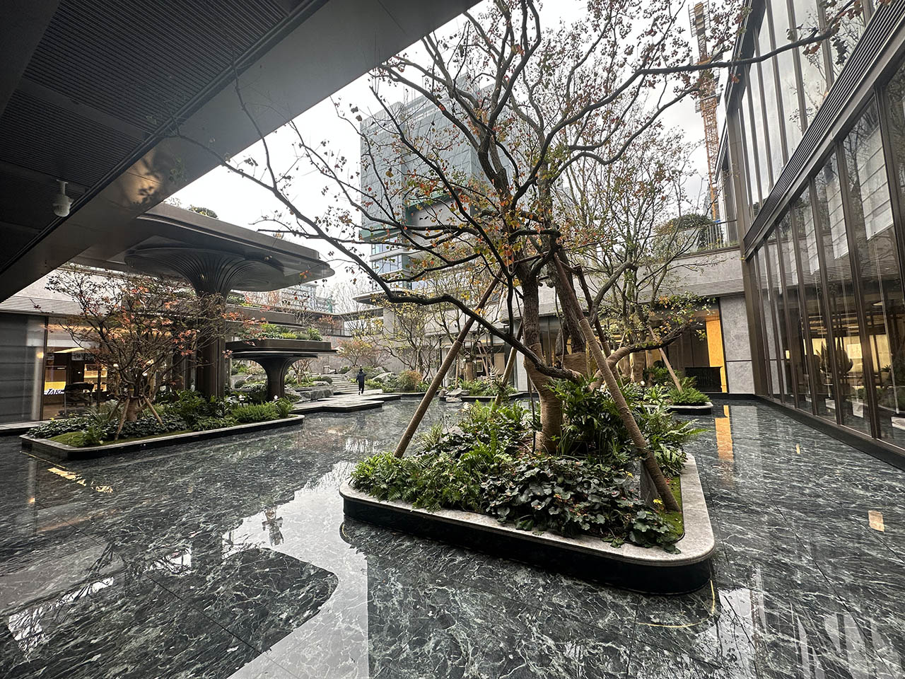 生态院落挑高高约6米,为植物生长预留充足采光空间,让自然向上生长,树冠完整舒展。