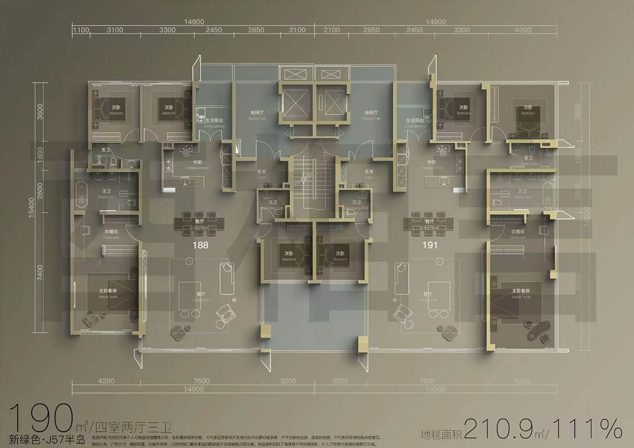 我们洋房在售的小面积户型是190平方的。四房三卫双套房设计。