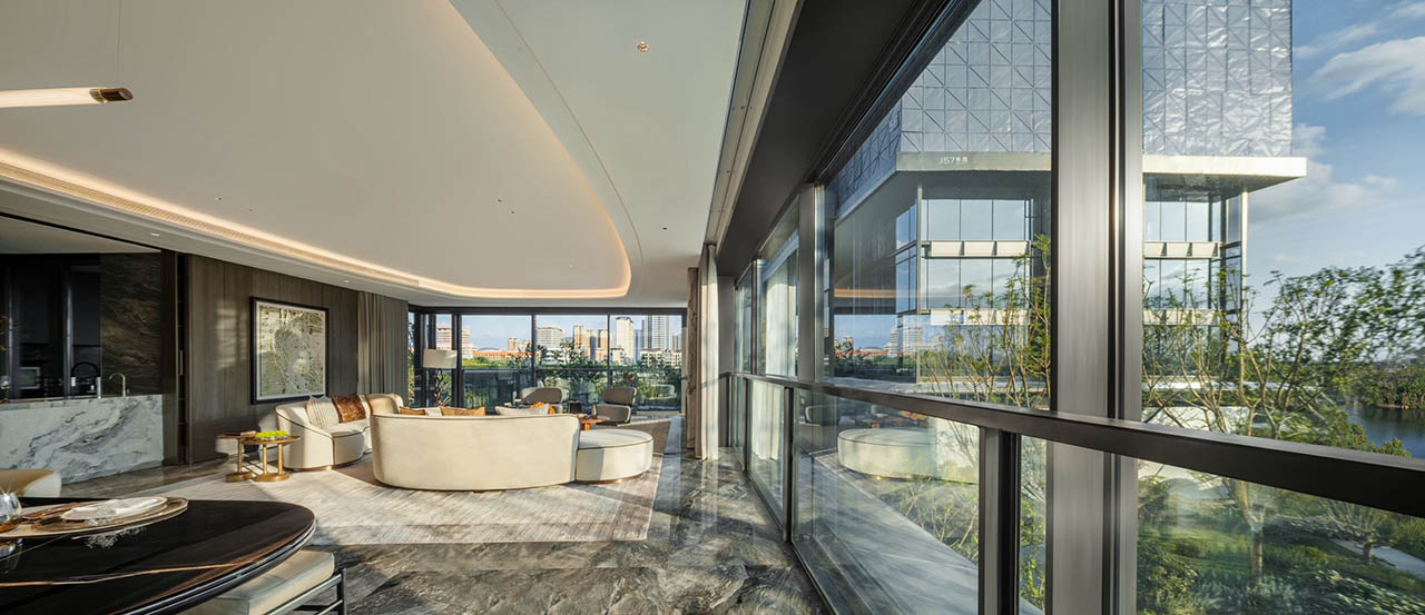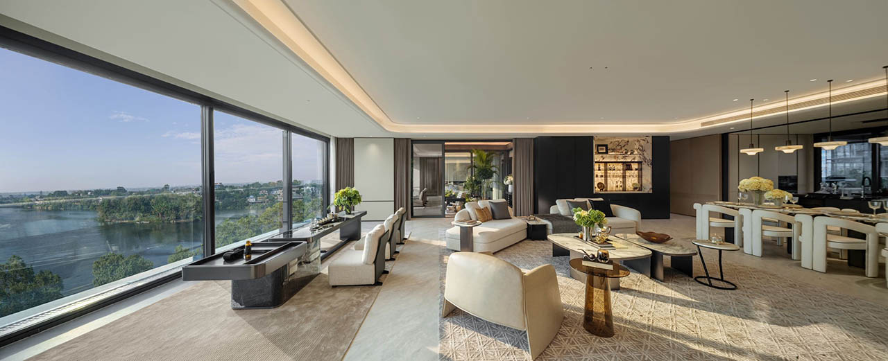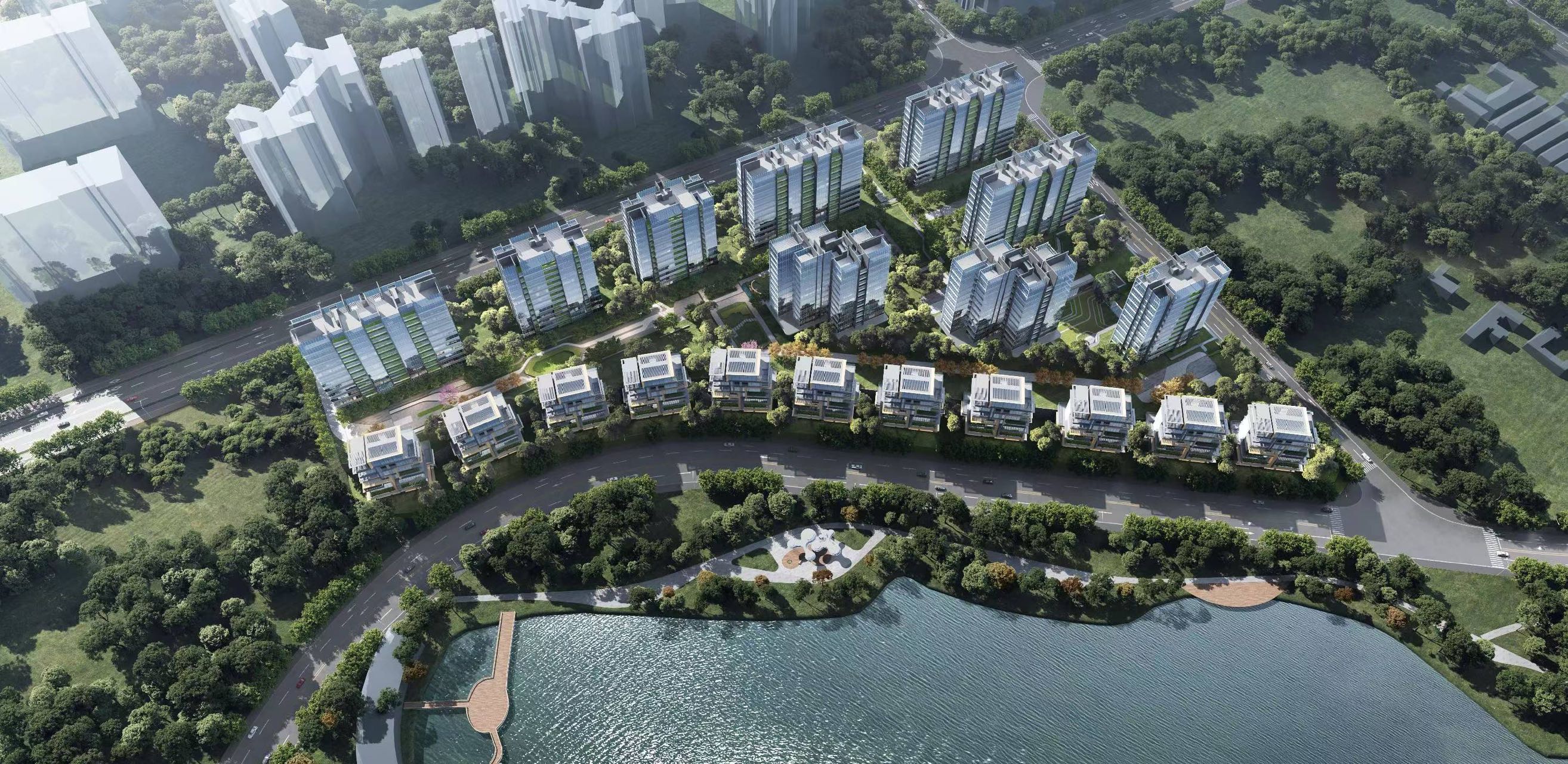 面对地块优质的一线湖景观资源,兼顾对湖景景观、地块标志性、人本生活体验的综合考量,以独特的“城市生态半岛”形态;“湖光入幕·自然共生——以玻璃为媒介重构湖岸天际线”的设计哲学,资源导向下的沿湖点式布局,塑造出与湖共生的高品质人居范本。