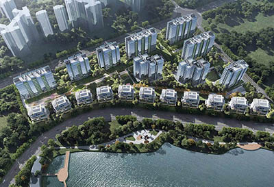 约11.6米的地势差,东北高,西南低,“顺势而构,因景成形”,全部南向一字拥湖排开,实现景观价值化,同时借助地形,不仅打造出更加立体的园林,更是将产品按洋房、上下院、岛院三种形态进行划分,为精致的产品力预留了现象空间。